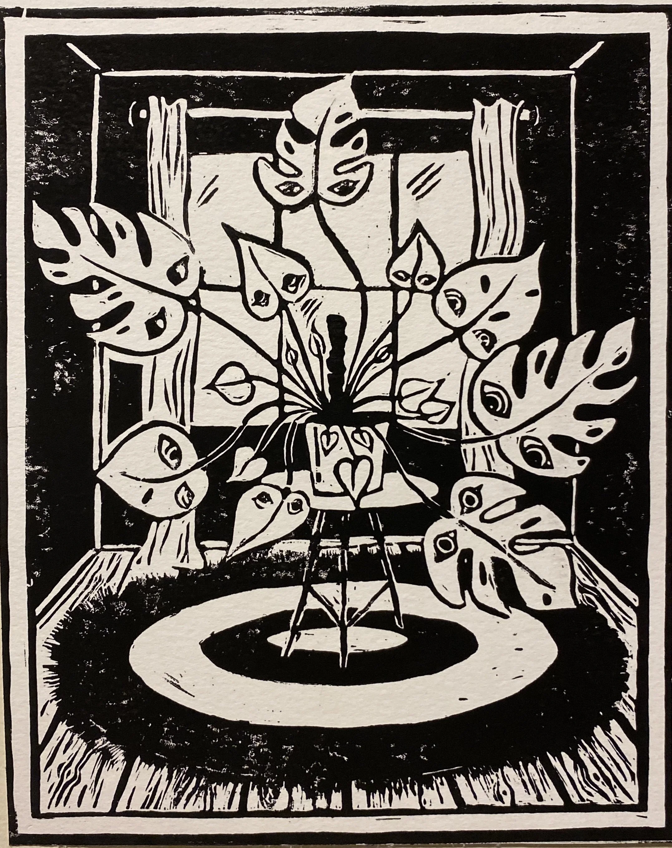 "Monstera with Eyes." 2020. Linocut print on paper. 8"x10"